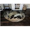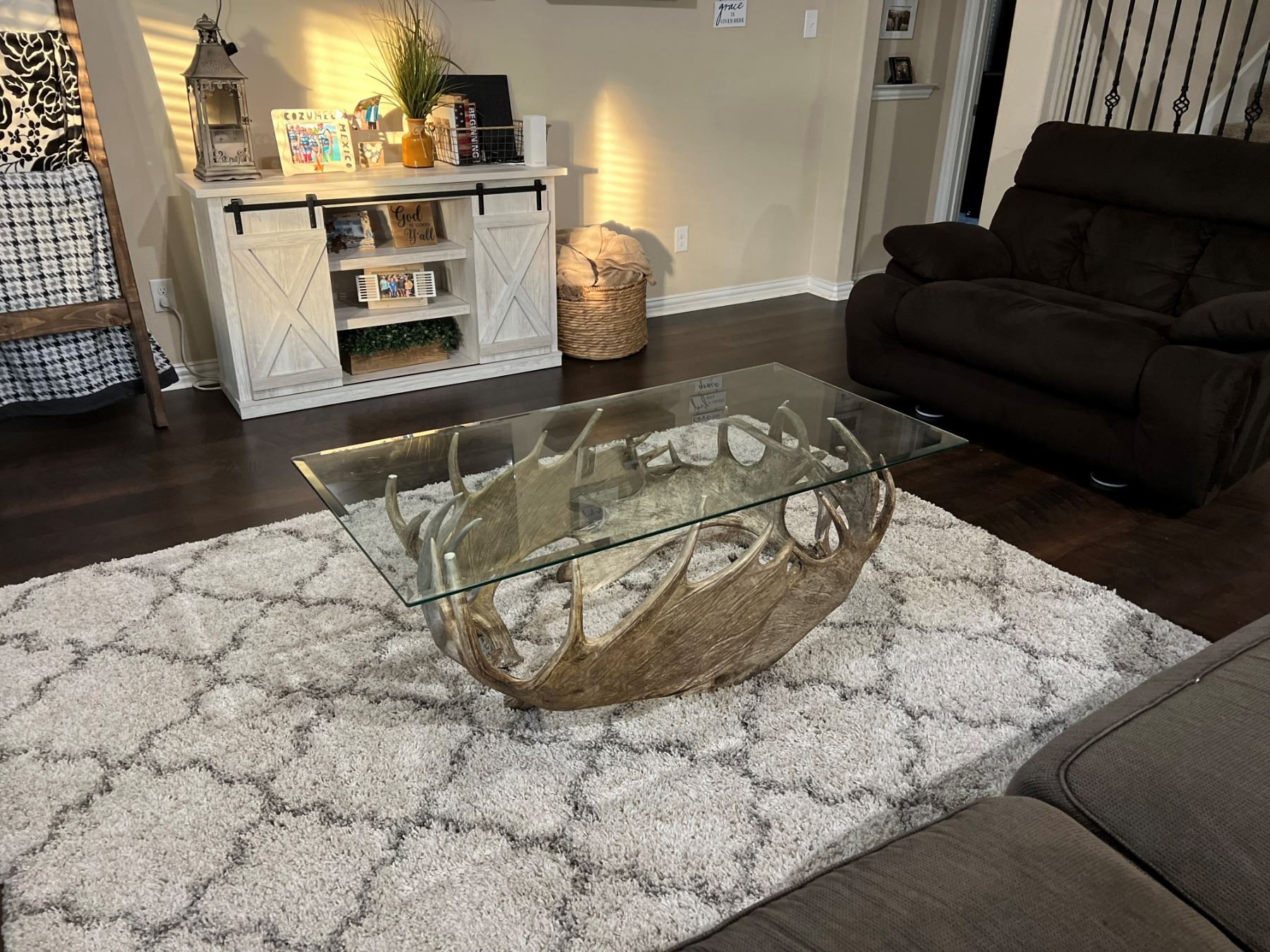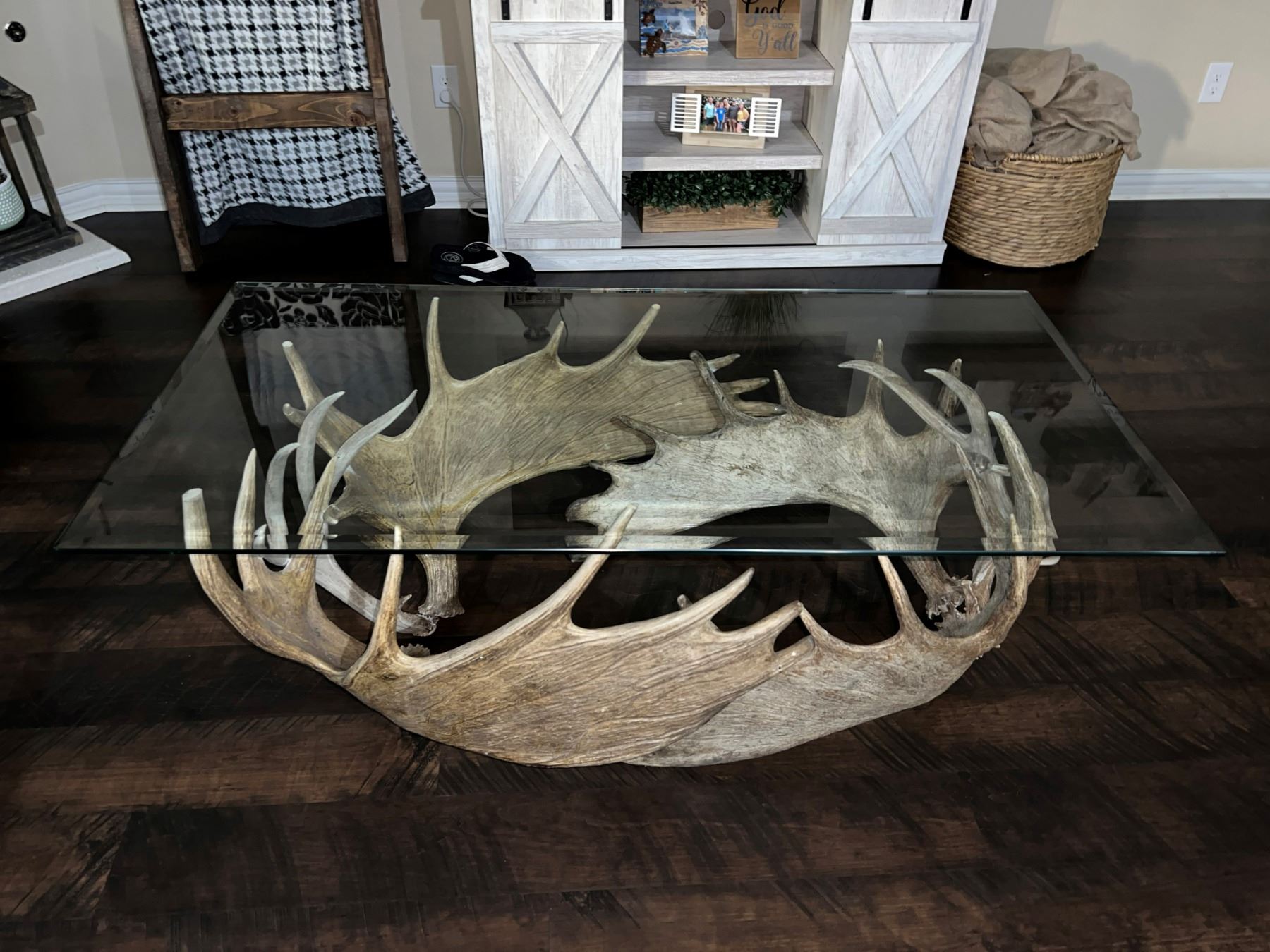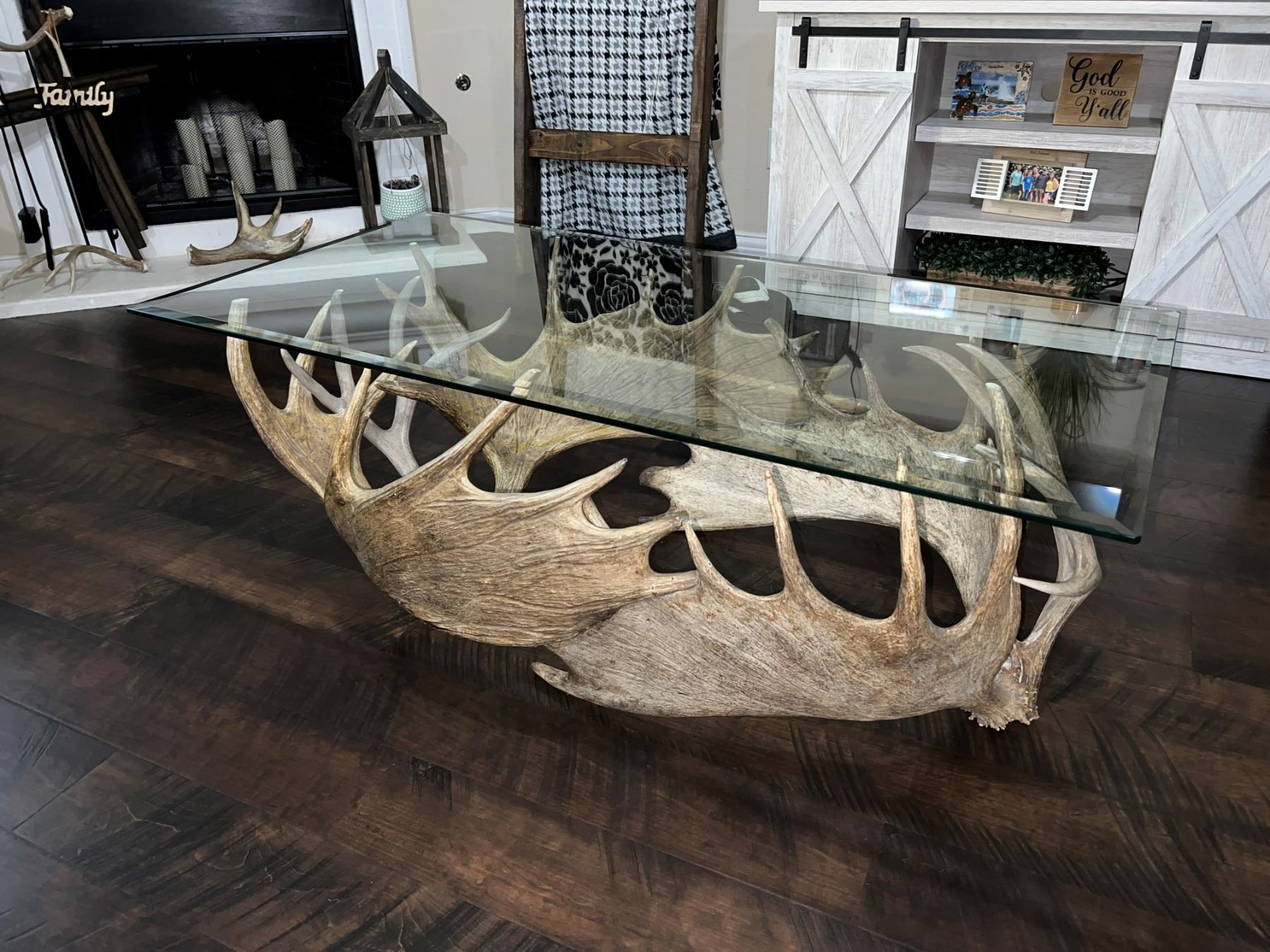 Official Measurer Eric Stanosheck of Antler Picasso has made this custom-built antler coffee table from four moose antlers and two large mule deer antlers artistically creating a great natural base for this 26” x 52” glass top coffee table. Height is 20”. One of a kind Antler Picasso design. A great conversation piece for any outdoorsman or woman.