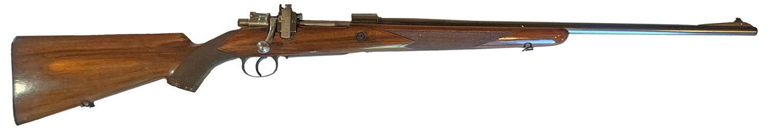 This early rifle wears serial number 1812 and is based on a Mauser Model 98-style action with a full-length extractor. Wood and metal finishes are strong. The bore is superb. Although drilled and tapped for an included single-piece base, the rear aperture sight (Lyman 48) remains in position.