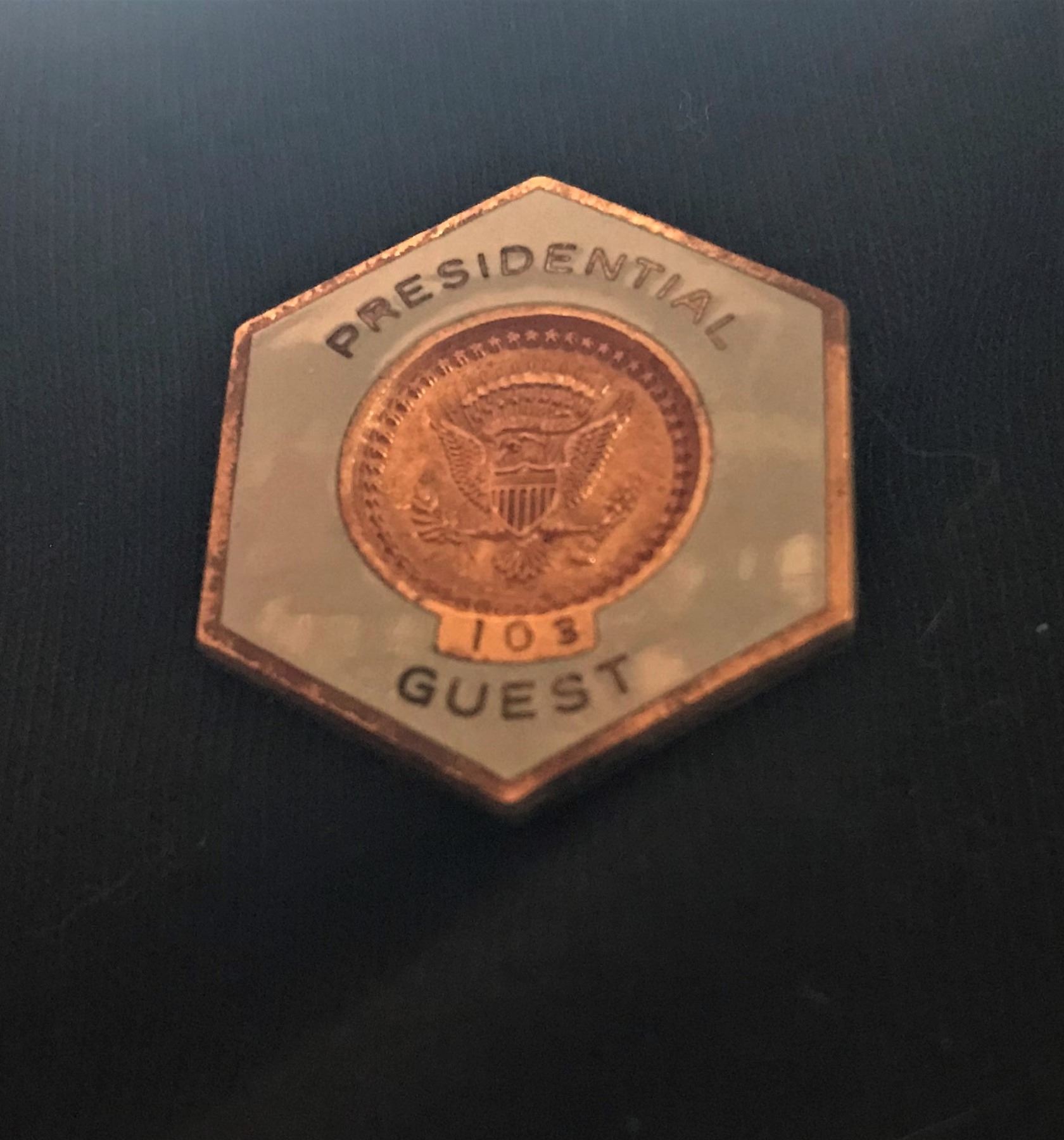 The day after Richard Nixon won the 1972 election he celebrated his victory by taking Air Force One to his compound in Key Biscayne, Florida. These unique pins were given to the official guests to identify them to security personnel allowing them to be in close proximity to the President. They are individually numbered beneath the Presidential Seal.