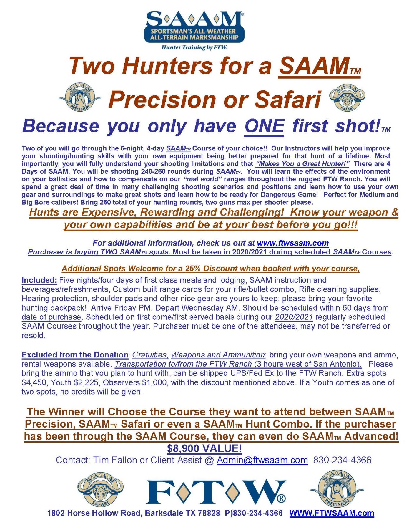 Two of you will go through the 5-night, 4-day SAAM Course of your choice!! Our instructors will help you improve your shooting/hunting skills with your own equipment being better prepared for that hunt of a lifetime. Most importantly, you will fully understand your shooting limitations. There are 4 days of SAAM. You will be shooting 240-260 rounds during SAAM. You will learn the effects of the environment on your ballistics and how to compensate on our “real world” ranges throughout the rugged FTW Ranch. You will spend a great deal of time in many challenging shooting scenarios and positions and learn how to use your own gear and surroundings to make great longer-range shots and learn how to be ready for dangerous game! Perfect for medium and big bore calibers! Bring 260 total of your hunting rounds, two guns max per shooter please.